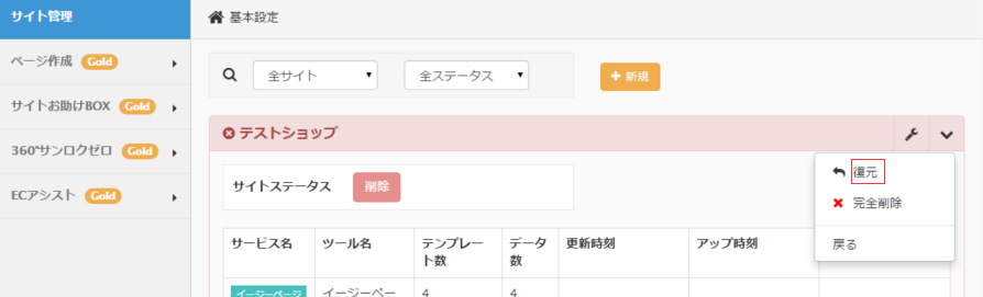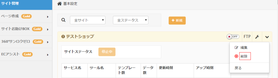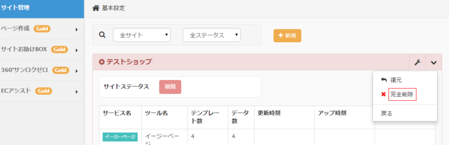2.サイトステータスが「削除」になることを確認し、「完全削除」で完全削除されます。