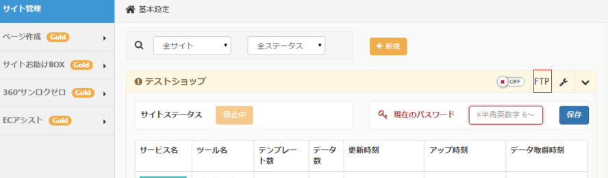 FTPのパスワードのみを変更する場合は、「トップ」>「FTP」で最新のパスワードを入力し、「保存」で更新できます。